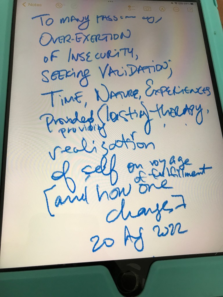 Time, nature, experiences, providing therapy, realization of self, on voyage of fulfillment