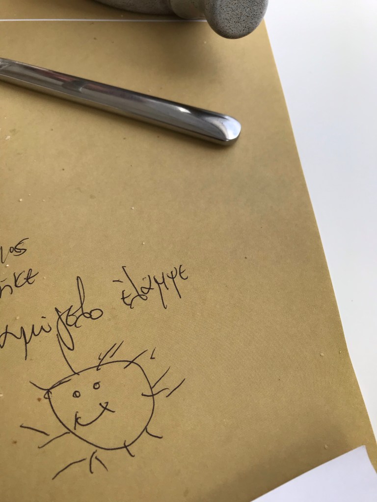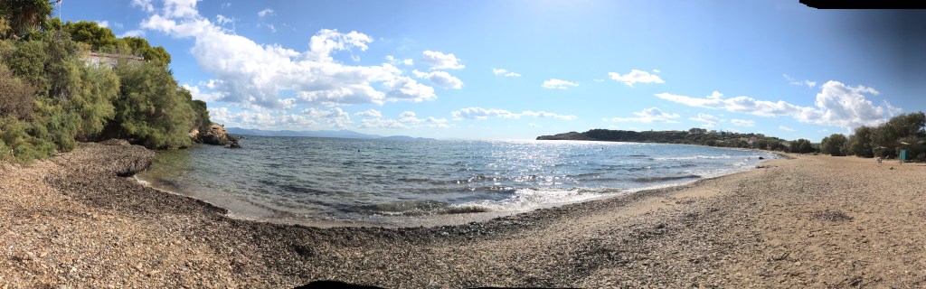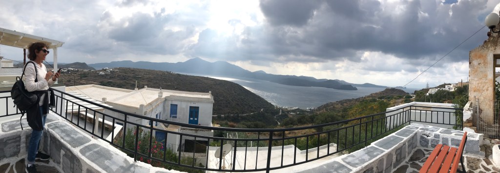 In presence of Gaia and family, staring into tapestry, symmetry of marble, blue sea and sky;