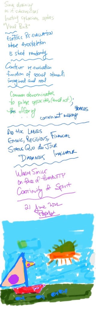 « Η καλή μέρα απ’το πρωί φαίνεται» Πρωινή θεραπεία, θαλασσινή δόση, Παρουσία αγαπητών φίλων, η μέρα μας έφτιαξε Morning therapy, sea as elixir, presence of dear friends, our day is set ΟΜ 7 Ιουλίου 2018I. BEACH Body and mind, entering water; Balance Buoyed by sea, soul enters equation, mental anchors fade; We are one with nature I’. ΑΥΡΑ ΨΥΧΗΣ Αίσθημα και διάθεση εν πλω, η θάλασσα γυαλί οι συνάνθρωποι εμπνέονται Άλλο αξέχαστο στιγμιότυπο στην τσέπη Feelings and disposition floating m, calm sea our fellow synanthropes inspired Another unforgettable snapshot stored in our memory ΟΜ 17 Αυγούστου 2022I’’. MARIKES MORNING Ceiling of sunlight, the relaxing sea sea; pheromones flowing, cortisol dissolved 25 Sept 2021II. CLIQUES Pods of people, gathering in early morning sociology and psychology merging Leaders of pod vocalizing, discerning our existence, drawing attention; We exist as side dish to their social menuIII. RESOLUTION Those who approach, and are approachable; With no expectations, reserve, insecurities resolved Life, enhanced by understanding, conversation; Vibrancy of humanity Nourishment of soul, convergence of Helios and Poseidon 23 July 2022«Ουδέν κακών αμιγές καλού»* Άρνηση στην παραλία, ο ήλιος, η θάλασσα την σκέπασε με θετικότητα φορτώνοντας τα κύτταρα χαλαρότητας Negativity at the beach; The sun, the sea covered it with positivity charging cells of relaxation *from the bad comes good 25 Αυγούστου 2021